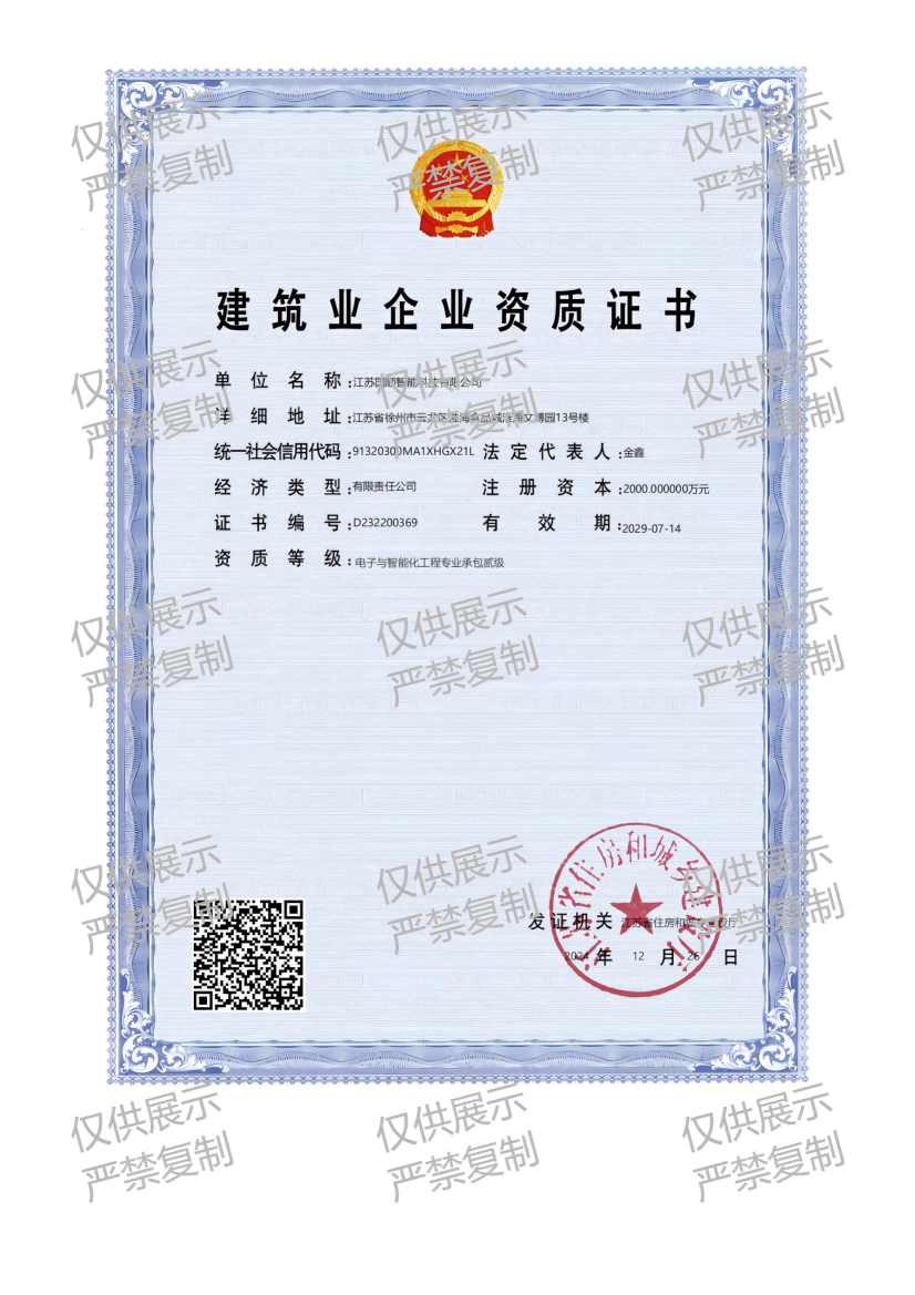 公司取得《电子与智能化工程专业承包贰级》资质,进军智能化工程领域。